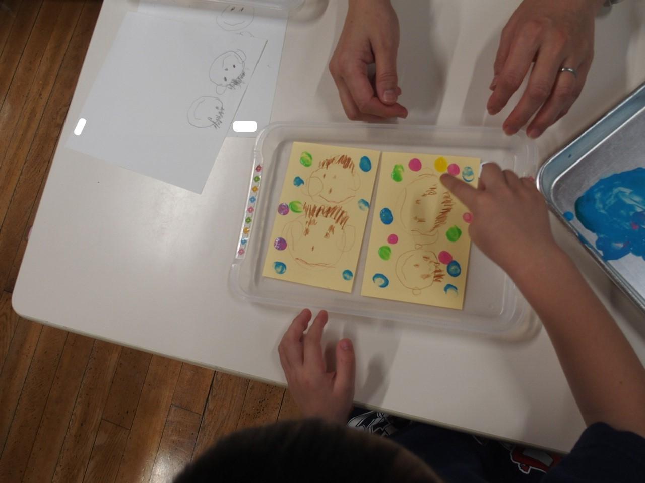 ひつじ組は絵の具と型紙を使ってぶどうのステンシルカード。