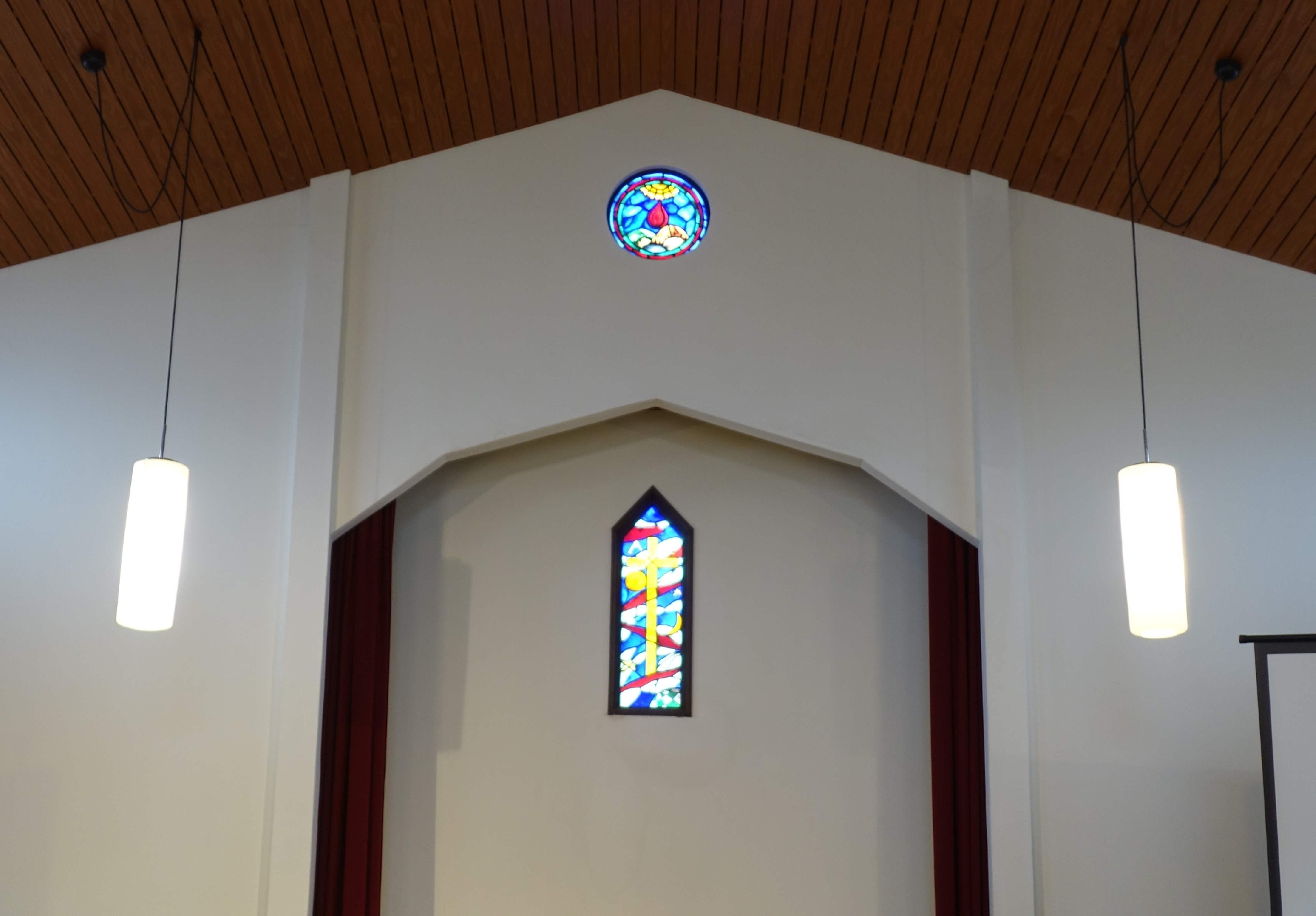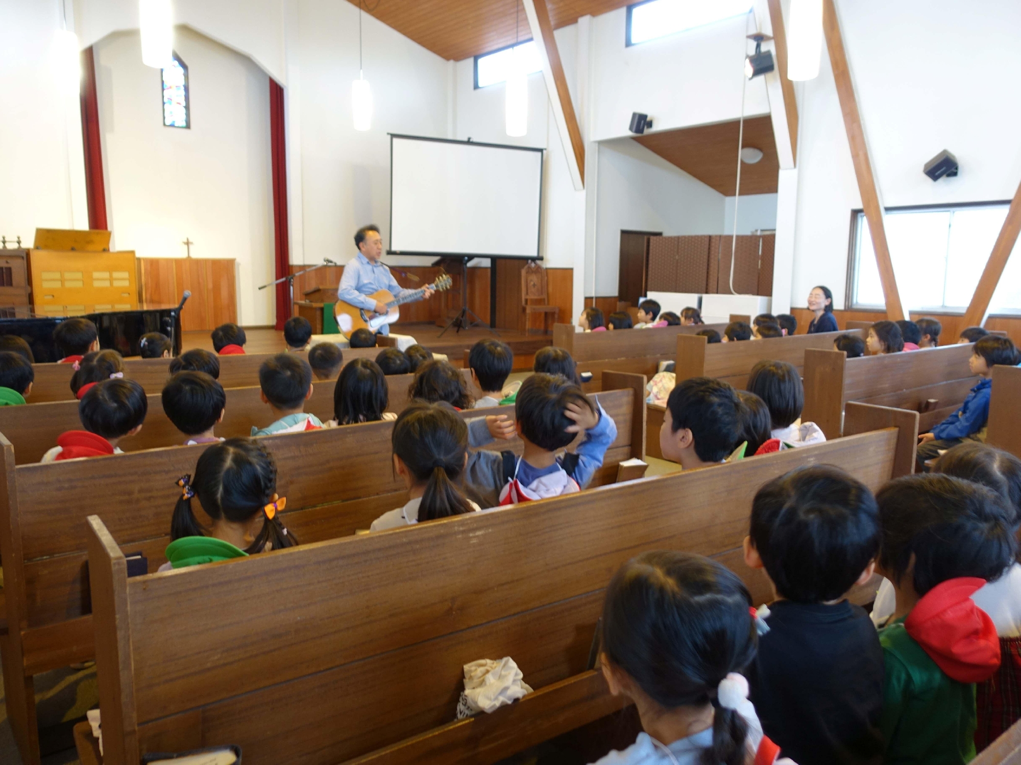 講壇に掛けられた布を見て「どうして緑の布がかかってるの?」や、「窓ガラスがきれい!」とステンドグラスを指さしたり、十字架を指さして「あのマークはなあに?」と尋ねたり・・・。