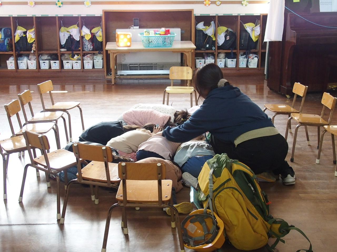 などを確認し、防災頭巾をかぶってお迎えを待ちました。