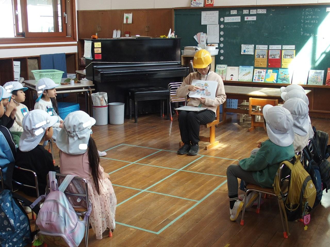 「緊急地震速報のナマズくん」を聞いて、それぞれいる場所で自分の身を守る安全なポーズをとりました。
