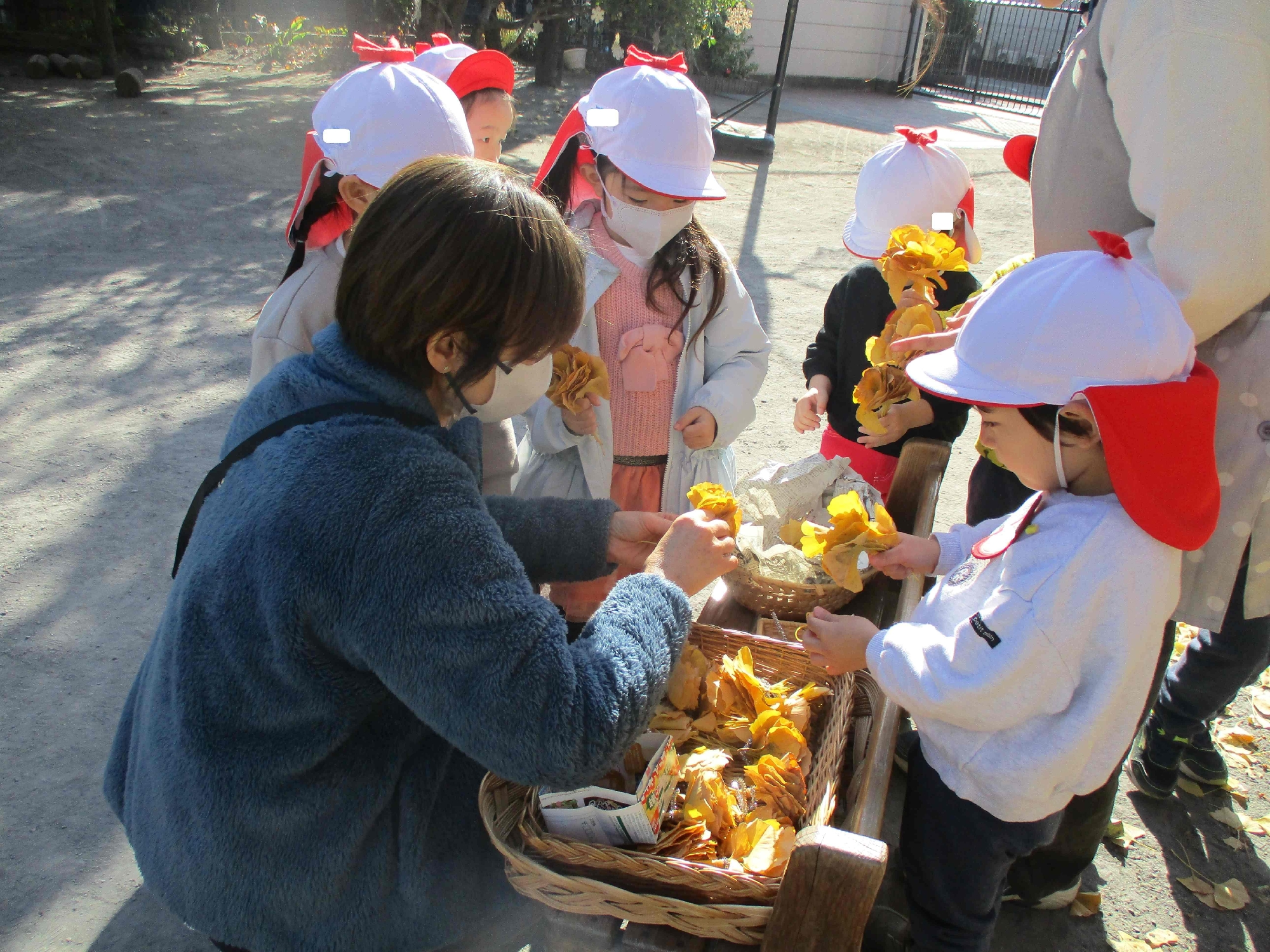 ハラハラと葉が落ち始めると、「こんな大きな葉っぱみつけたよ」「たくさん集めたよ!」と、子ども達は宝物のようにきれいな葉っぱを集めます。