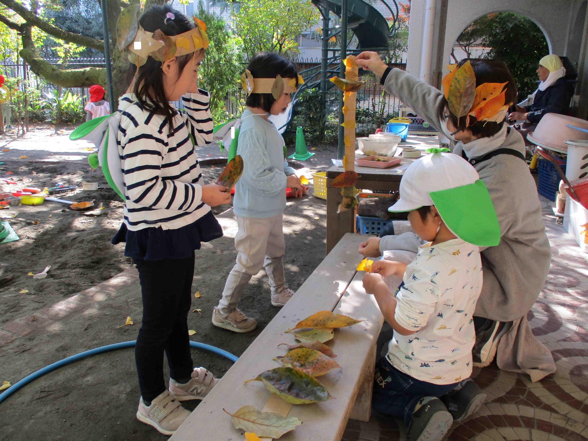 「もっとたくさん葉っぱ集めよう!」「もう一回!」と何度も夢中になって楽しんでいました。