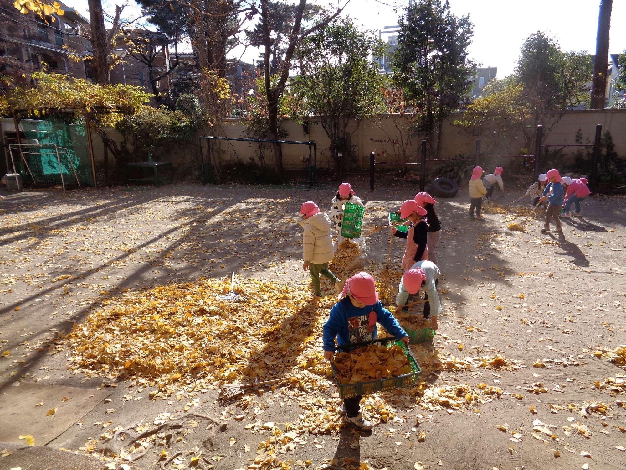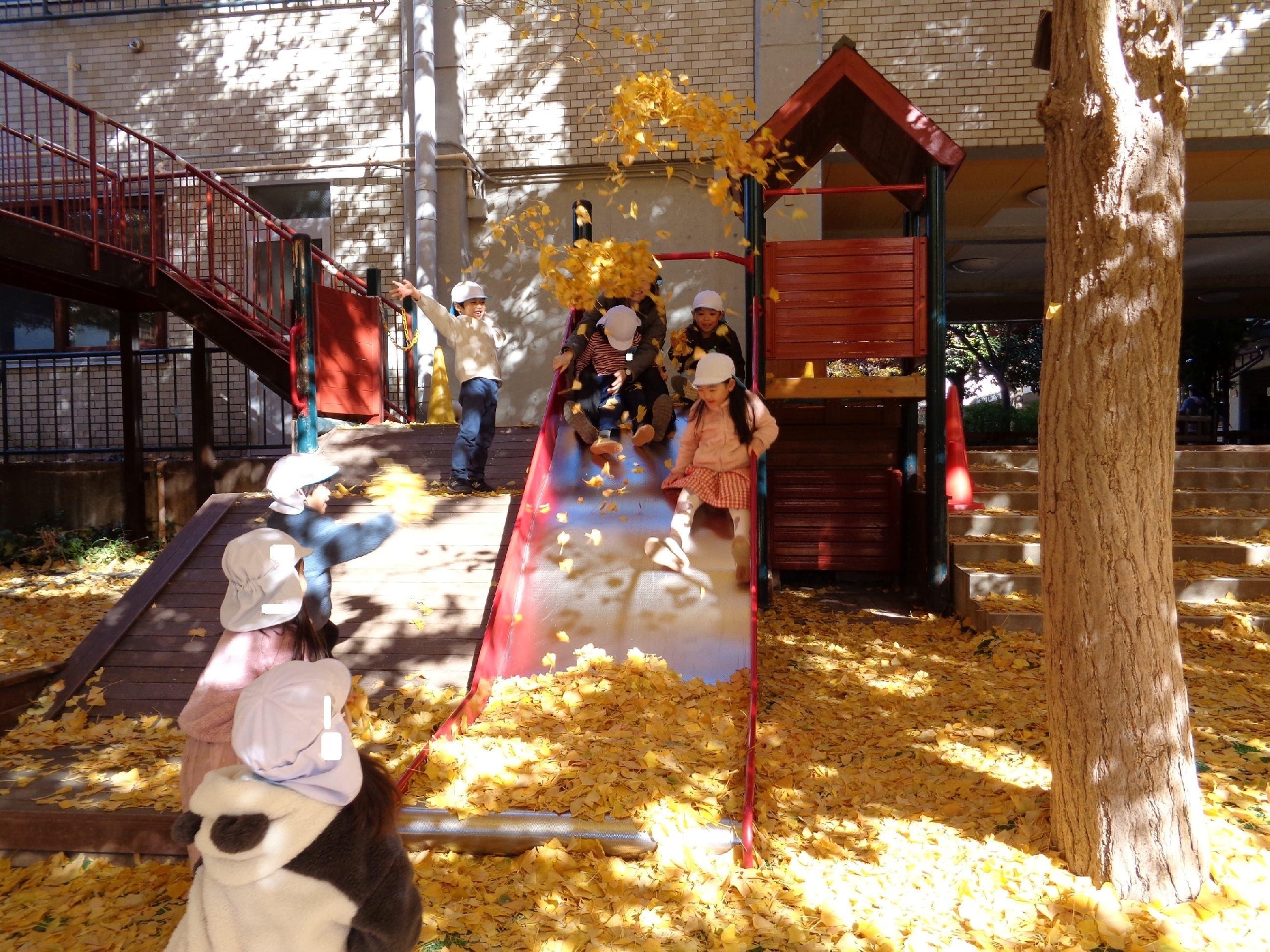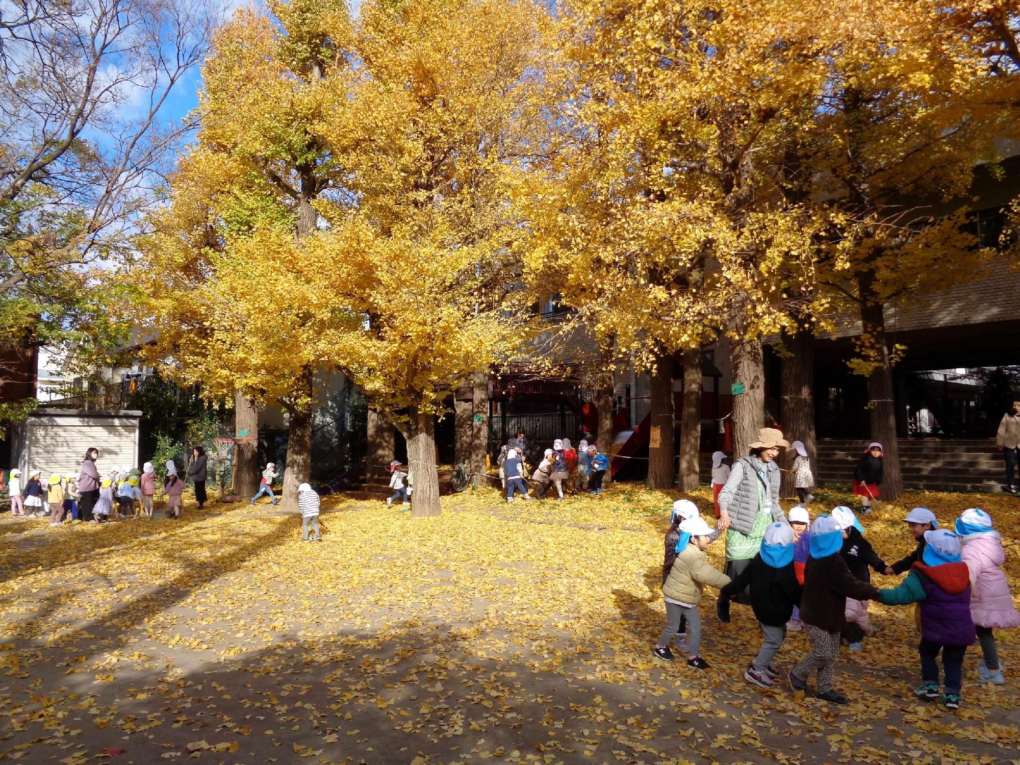 たくさんあるイチョウの木から葉が落ちると、幼稚園のお庭は黄色のじゅうたんのようになります。