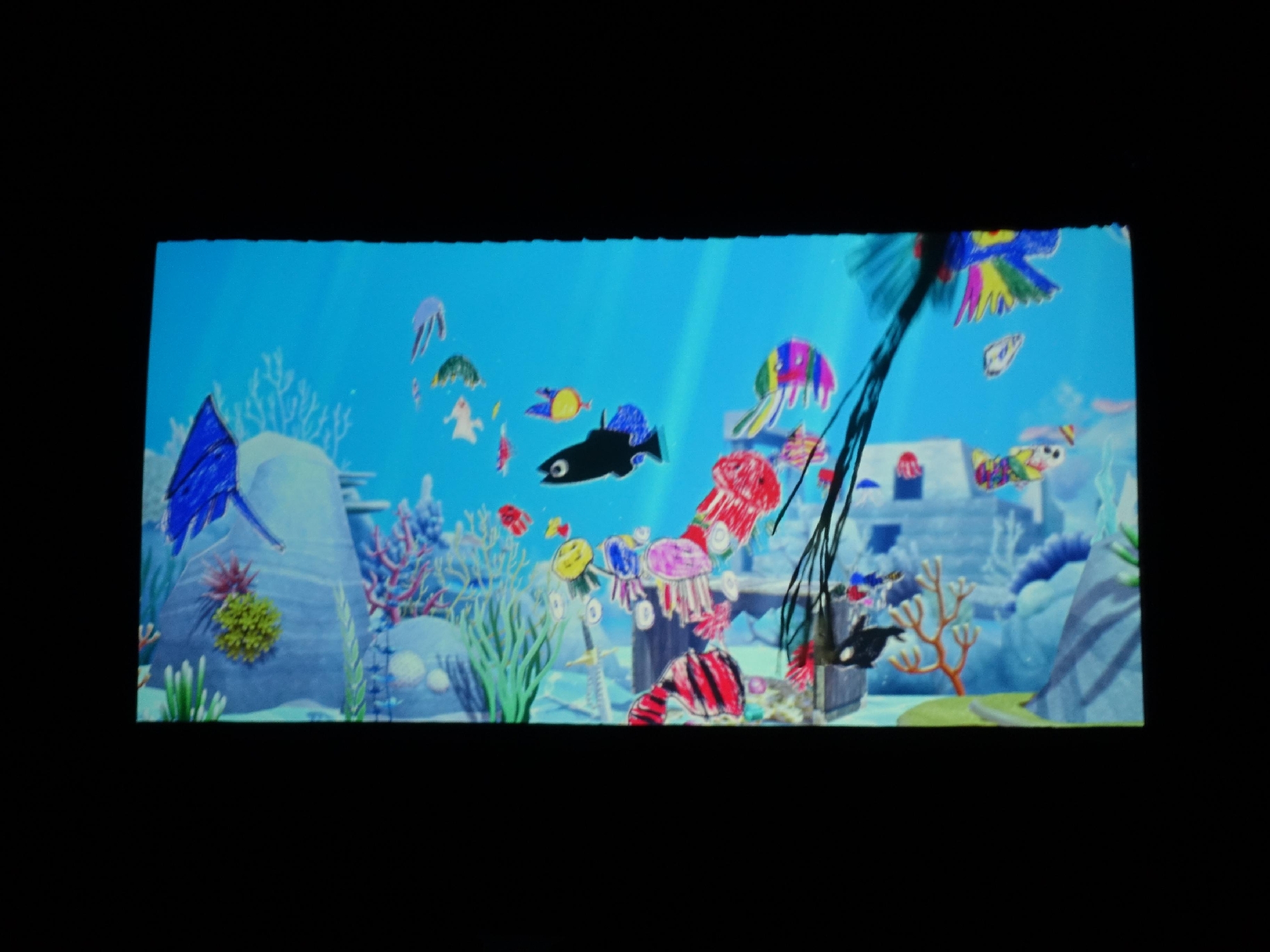ホールに入るとスクリーンの海にゆり組が描いた魚やタコ、イカなど生き物がたくさん泳いでいます。
