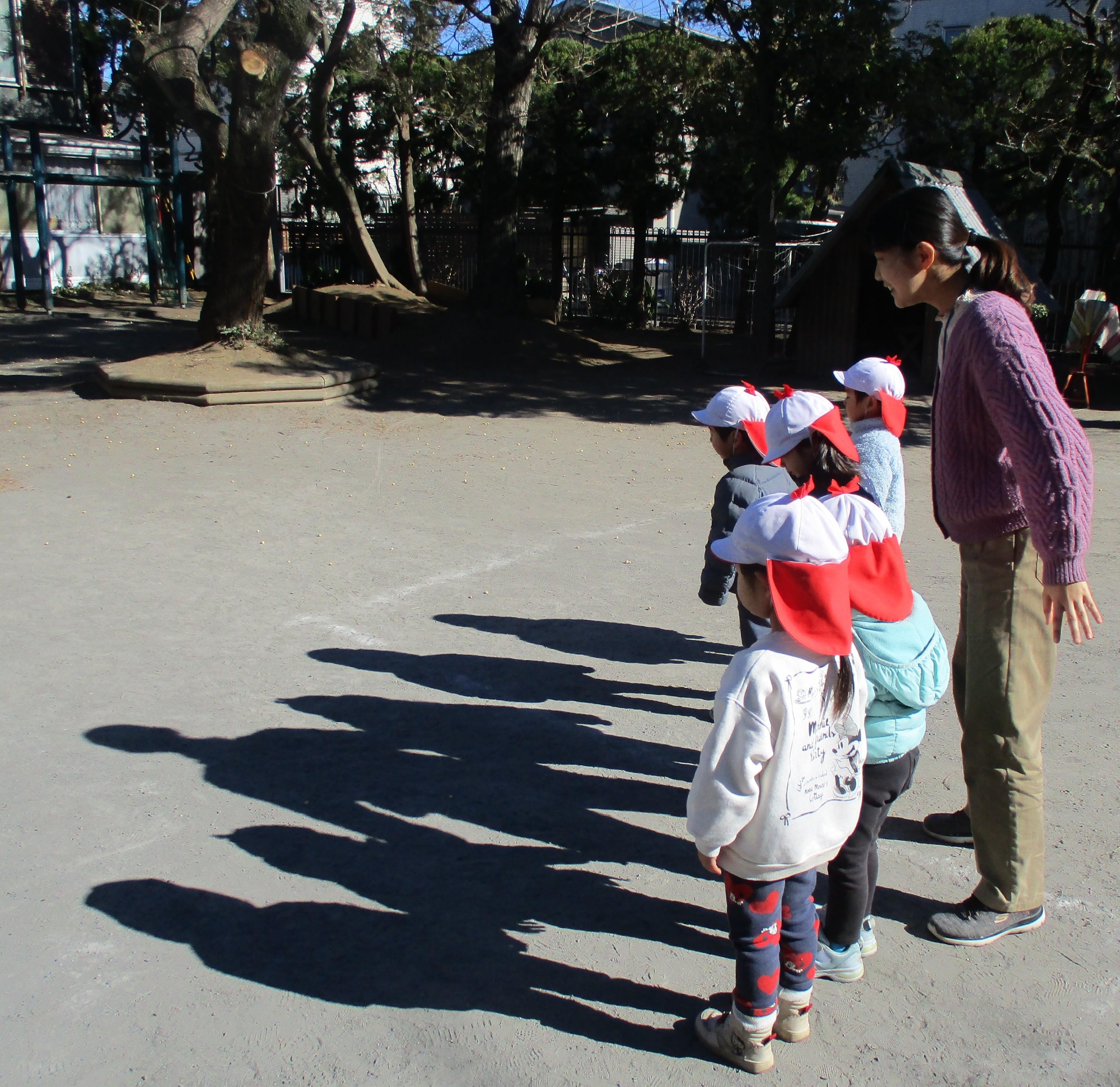 園に戻った子ども達は、早速園庭の地面に映った自分の影を見つめて「影おくり」に挑戦。